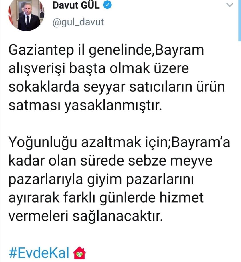 “Gaziantep il genelinde,Bayram alışverişi başta olmak üzere sokaklarda seyyar satıcıların ürün satması yasaklanmıştır.
