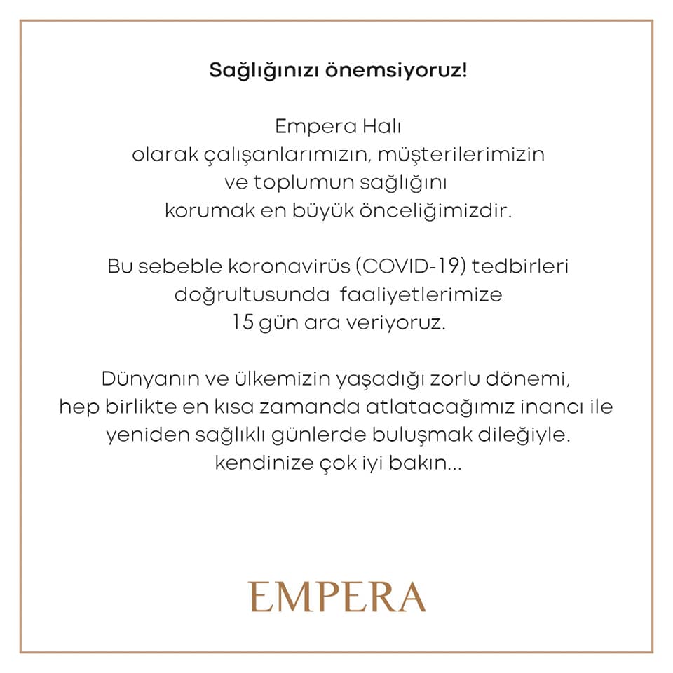 Gaziantep ‘in en büyük halı firmalarından olan Kaplan Kardeşler Yönetim Kurulu Başkanı Empera Halı çalışanlarını izin verdi. Salahattin Kaplan,” Empera Halı Olarak çalışanlarımızın, Müşterilerimizin ve toplumun sağlığını korumak en büyük önceliğimizdir. Bu sebeple Koronavirüs (COVİD -19) tedbirleri doğrusunda faaliyetlerimize 15 gün ara veriyoruz. “dedi.