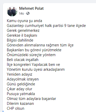 CHP Genel Merkezi 9 Kasım 2020 Gaziantep il ve 9 ilçe başkanı görevden alındıktan sonra bir daha yaklaxık 2 ay önce M. Neşet uçar’ı atanmasına rağmen bir türlü ilçe başkanların durumu netlik kazanmadı. Karkamış Başarılı ilçe başkanı Mehmet Polat sosyal medyada yayınladığı mesajla tekrar aday olduğunu belirtti. Mehmet Polat benim ilçe belediye kazanan ilçe olarak yönetimle birlikte başarılı olduğumuz inanıyoruz. Yapılacak olan seçimde tekrar aday olacağını belirtti. İşte sosyal medyadaki mesaj