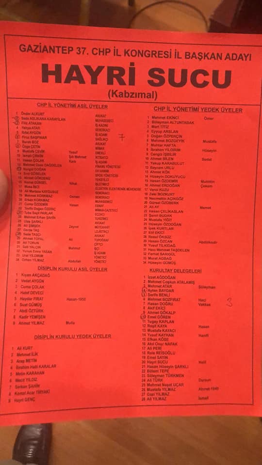 CHP 37’nci İl Kongresi’nde kazanan isim daha önce genel merkez tarafından görevden alınan Hayri Sucu oldu. Şato Restoran’da partililerin büyük ilgi gösterdiği kongrede Hayri Sucu, Lütfü Demir ve Murat Uslu yarıştı. Birliktelik mesajlarının verildiği kongrenin divan başkanlığını CHP Genel Başkan Yardımcısı ve Malatya Milletvekili Veli Ağbabayaptı. CHP PM Üyesi ve Kahramanmaraş Milletvekili Ali Öztunç, milletvekilleri Baha Ünlü, Ayhan Barut, Burhanettin Bulut, Gökhan Zeybek, Suat Özcan ve Özgür Ceylan kente gelerek kongreye katıldı. Oyların sayılmasına saat 19:00’dabaşlandı. Seçim sonrasında Hayri Sucu 310 oy alarak bir dönem aradan sonra yeniden başkan seçildi. Mevcut başkan Lütfü Demir ise 282 oy aldı. Son anda aday olduğunu açıklayan Murat Uslu ise 6 oyda kaldı.